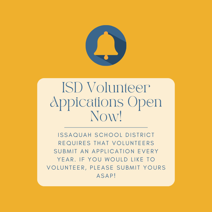 It has come to our attention that a couple of volunteers had to be turned away due to being unaware of the need to complete a volunteer application with Issaquah School District. In order to volunteer in ISD's schools, volunteers must complete a volunteer application and receive approval via email that their application has been approved. A new application must be submitted and approved each school year. If there is a chance you want to volunteer in any capacity, either with PTA or within the school itself, you must complete this process. You can access the volunteer application HERE.
